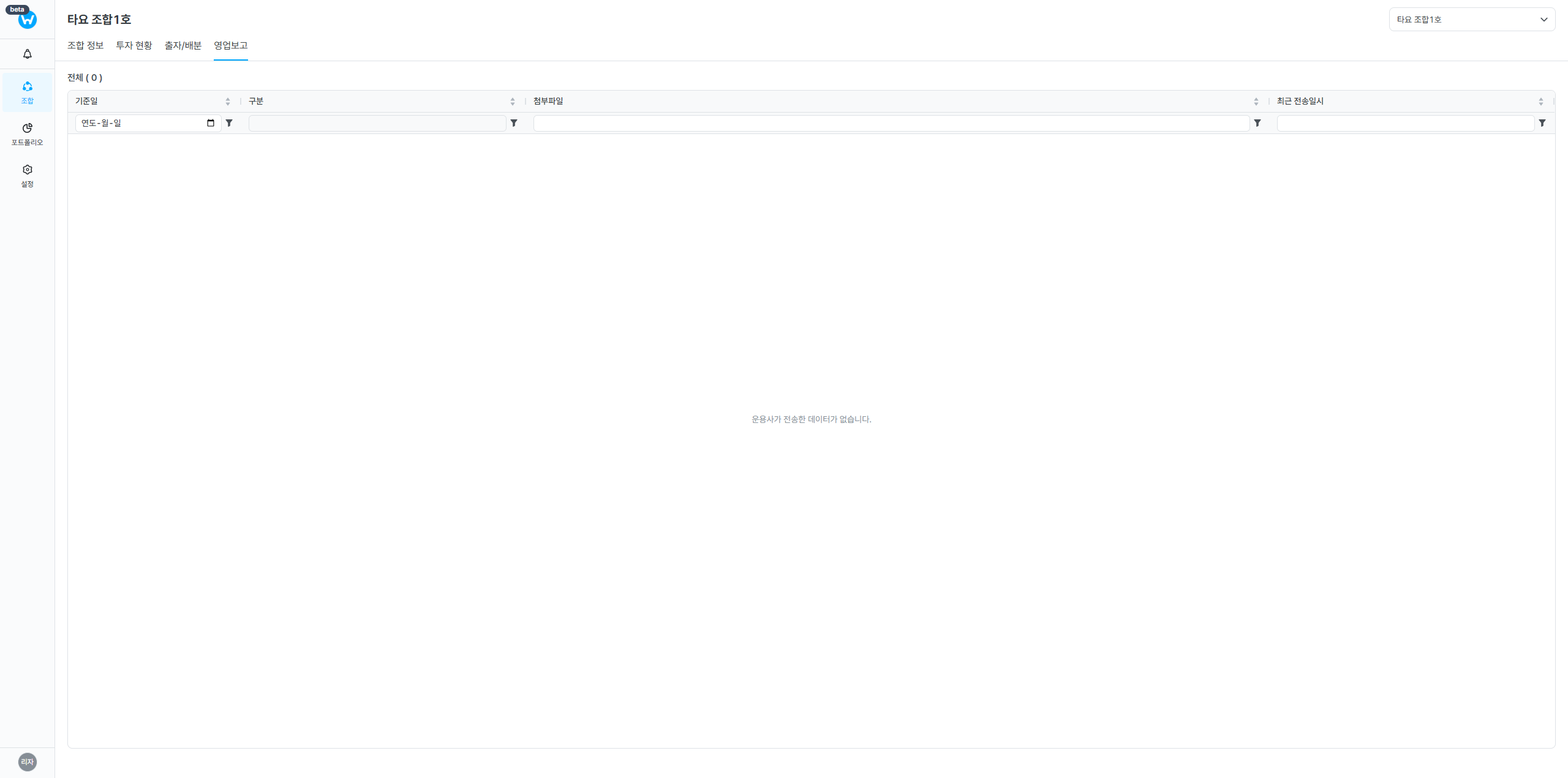 조합 영업보고 게시 2025/07/27 업데이트 2025/09/19 By 1 분읽는 시간 조합 영업보고 바로가기 조합 영업보고 조합 영업보고는 운용사가 제출한 영업보고서를 확인할 수 있는 화면입니다.영업보고상세운용사에 조합에 관하여 제출한 모든 첨부파일을 확인할 수 있습니다.구분운용사가 전송한 첨부파일의 유형을 설정할 수 있습니다.대표적으로 반기보고, 온기보고, 분기보고, 기타 등이 있습니다. 조합 조합 영업보고 똑똑의 모든 글은 CC BY 4.0 라이센스를 따릅니다. 공유하기