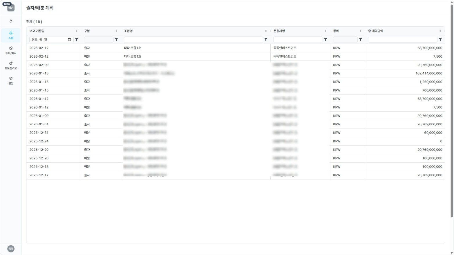 - 출자/배분 계획에서는 조합원이 GP로부터 본인에게 전달된 출자/배분 계획을 조회하고, 해당 계획의 출자 요청일/배분 예정일별 상세 금액을 확인할 수 있습니다.