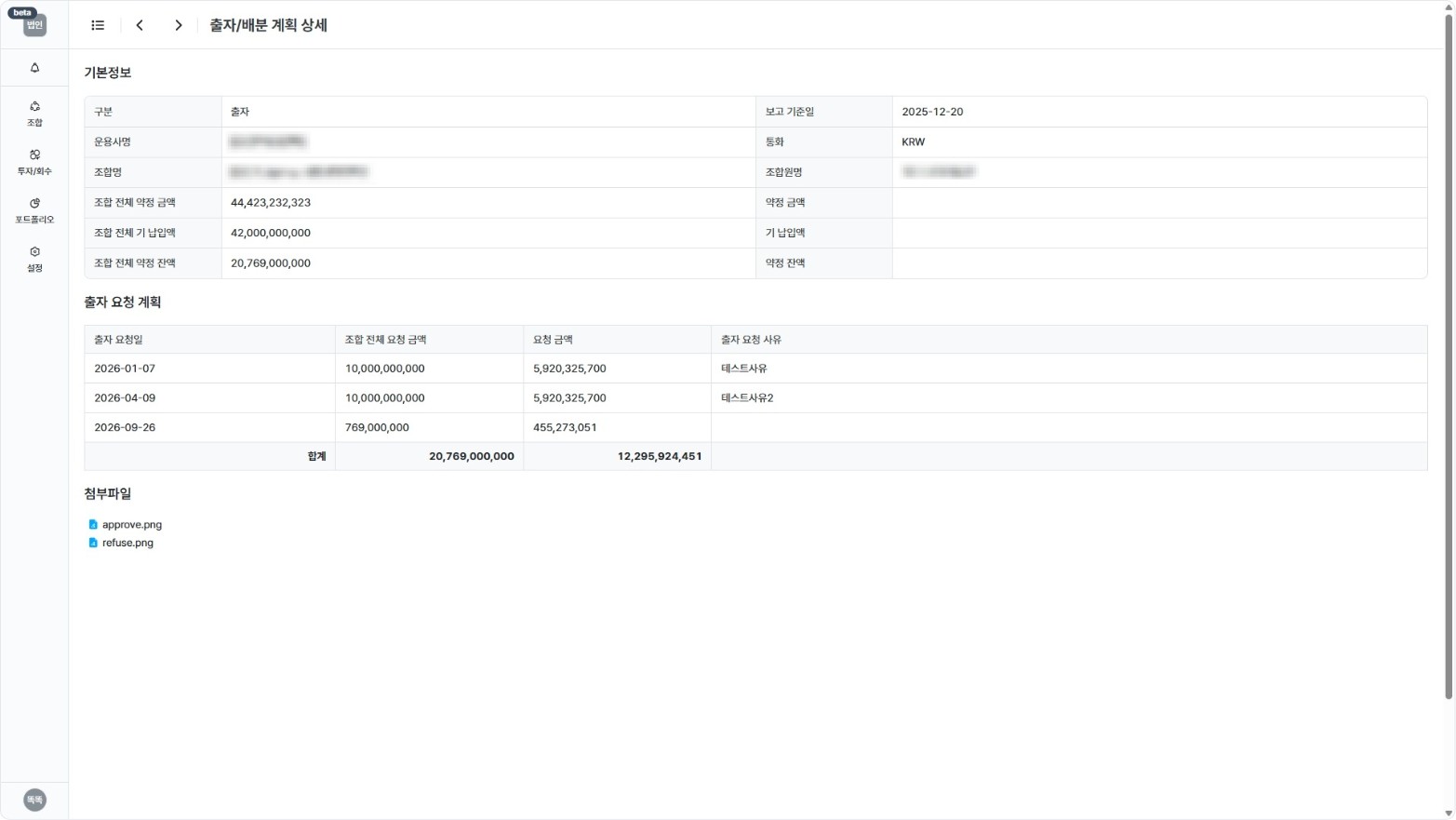기본 정보 하단의 출자 요청/배분 계획 영역에서는 해당 계획의 출자 요청일/배분 예정일별 예정 금액 상세를 확인할 수 있습니다.