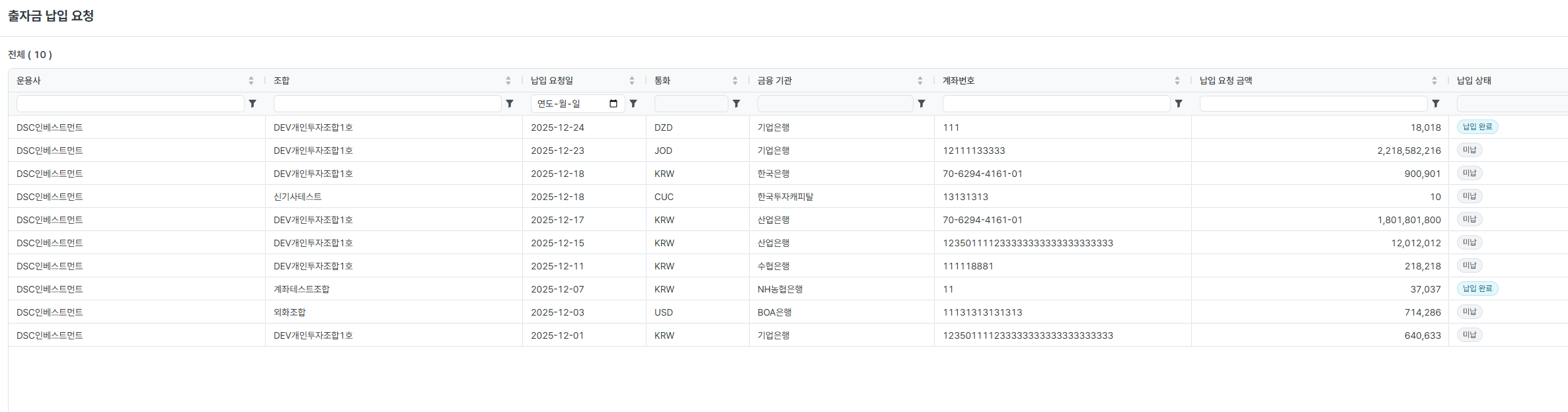 | 납입 요청 금액 | 해당 회차에 요청된 출자금 납입 금액입니다. |