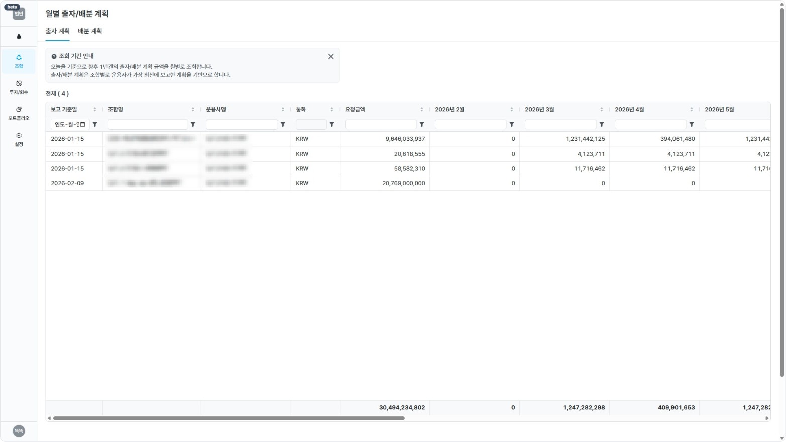 업무집행조합원이 전송한 각 조합의 출자/배분 계획 금액을 월별로 조회할 수 있습니다.