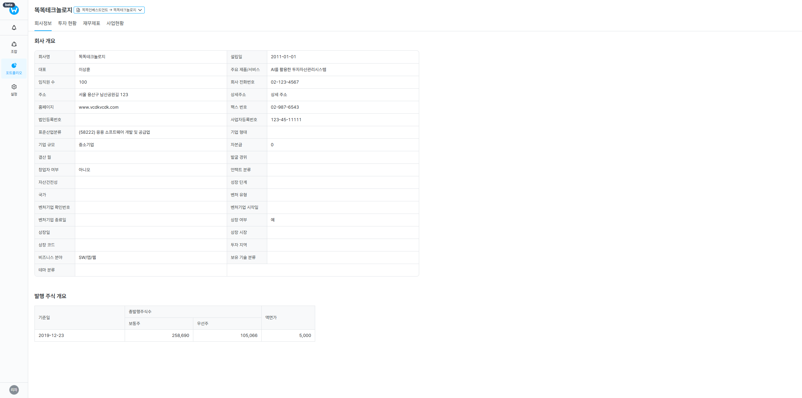 포트폴리오 정보 게시 2025/07/29 업데이트 2025/09/19 By 1 분읽는 시간 포트폴리오 정보 바로가기 포트폴리오 정보 포트폴리오 정보는 피투자기업의 기본 정보를 조회할 수 있는 화면입니다.회사정보회사 개요피투자기업의 기본정보를 제공합니다.대표, 홈페이지, 비즈니스 분야 등을 확인하실 수 있습니다.운용사를 변경하면 다른 운용사가 입력한 정보가 조회됩니다.발행주식 개요피투자기업의 총발행주식에 대한 정보를 제공합니다. 포트폴리오 포트폴리오 똑똑의 모든 글은 CC BY 4.0 라이센스를 따릅니다. 공유하기